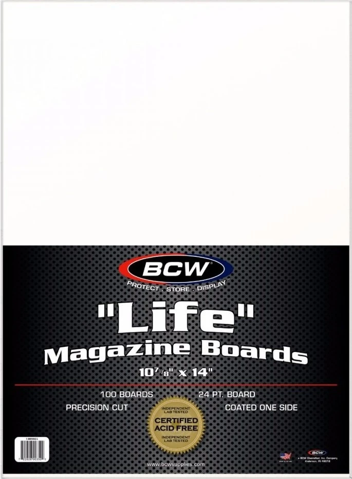 These backing boards are 10 7/8″ x 14″. Precision-cut, acid free, and coated on one side, they are designed for over-sized magazines (such as Life) and are intended for use with BCW’s Life magazine bags.