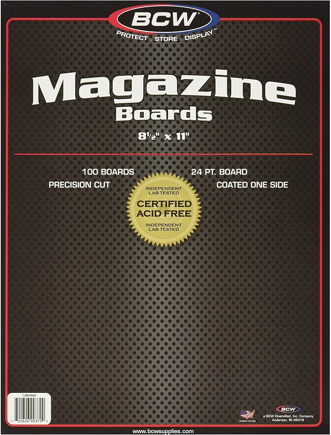These backing boards are 8.5″ x 11″. Precision-cut, acid free, and coated on one side, they are designed for magazines and are intended for use with BCW’s magazine bags.