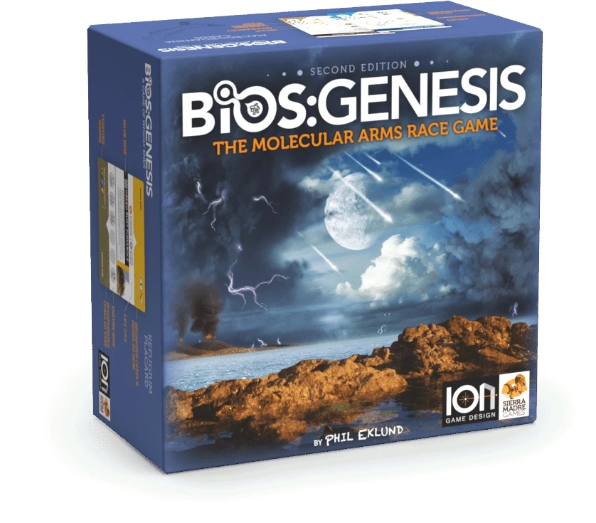 In Bios: Genesis, one to four players start as organic compounds shortly after Earth’s formation, represented by up to three Biont tokens. The Amino Acids command Metabolism, the lipids create cells, the pigments control energy absorption and storage, and the nucleic acids control templated replication. Their goal is a double origin of life: first as Autocatalytic Life (a metabolic cycle reproducing, yet not replicating, its own constituents), and the second as Darwinian Life (an Organism using a template to replicate in an RNA world). Players can play cooperative, competitive, or solitaire.