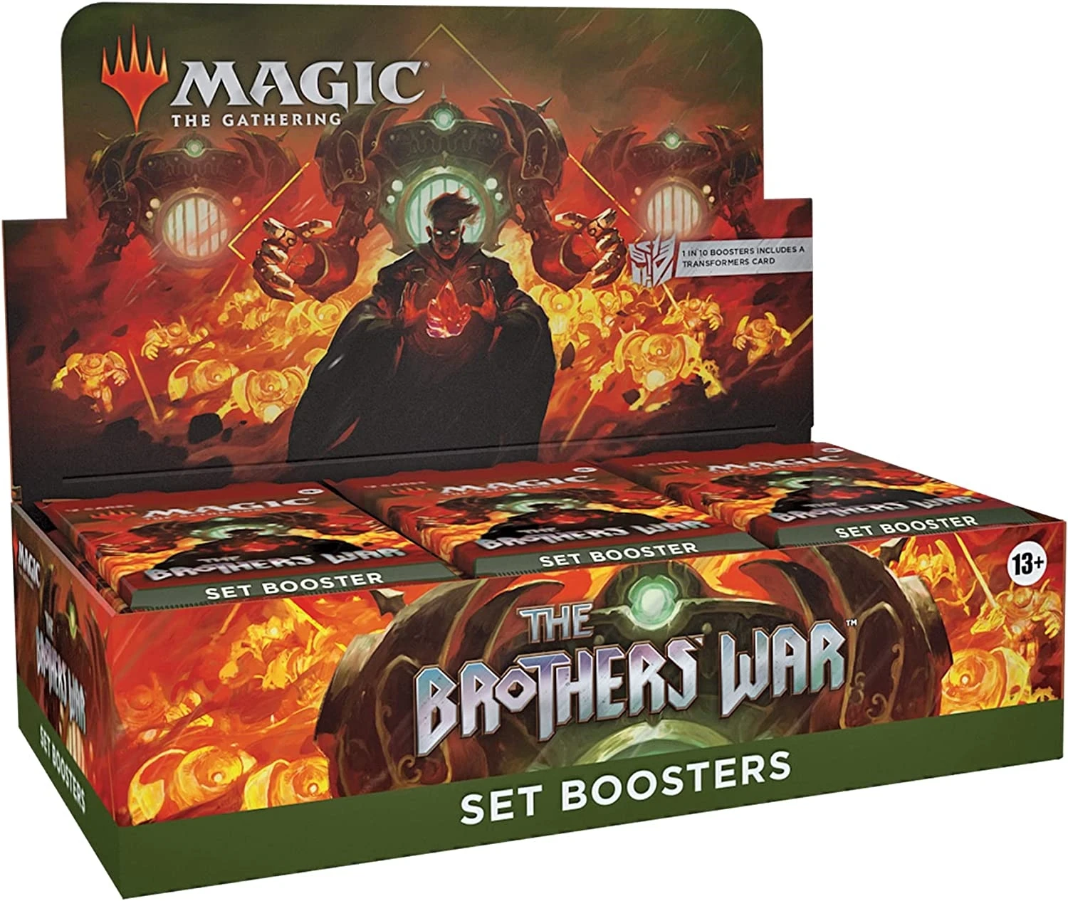 The Brothers’ War Set Booster Box contains 30 The Brothers’ War Set Boosters. Each Set Booster contains 12 Magic cards, 1 Art Card, and 1 token/ad card or card from “The List” (a special card from Magic’s history—found in 25% of packs).