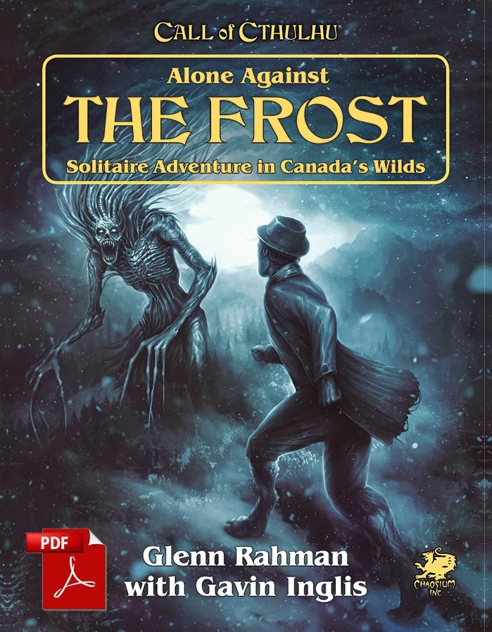 Alone Against the Frost is a solo horror adventure for one player, set during a research expedition to Canada’s Northwest Territories during the 1920s. Here, you choose your own path as you navigate through the story — your choices will determine whether you find success or failure! You take on the role of Dr. L. C. Nadelmann, an anthropologist from the renowned Miskatonic University in Arkham, MA. Accompanied by three of your most gifted and practical graduate students, as well as an experienced local guide, you set off into the fabled valley of the North Hanninah in search of the anthropological discovery that will make your career and bring you fame. Or, so you hope.