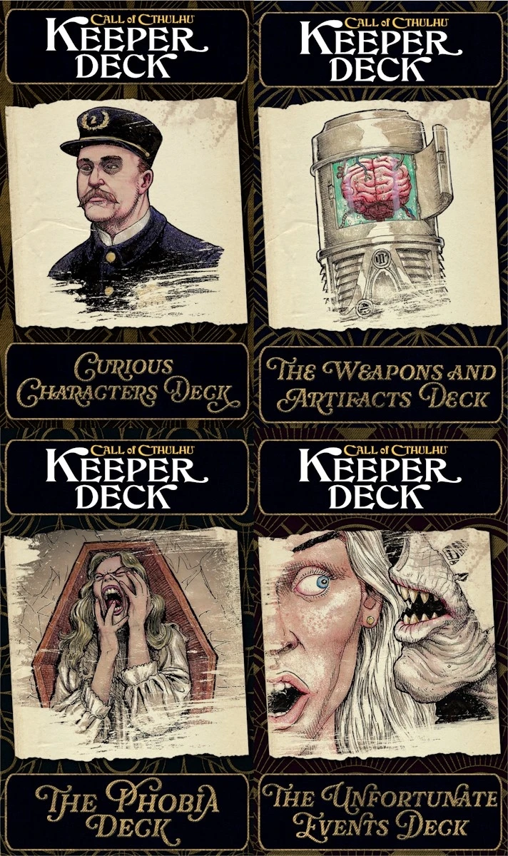 Call of Cthulhu Keeper Decks are designed to provide in game resources, handy references, and information. Use these decks to supplement scenarios, for inspiration when designing new encounters, to pass secret and important notes to players, and as a handy way to impart information. This second edition brings you all new artwork as well as some errata updates.