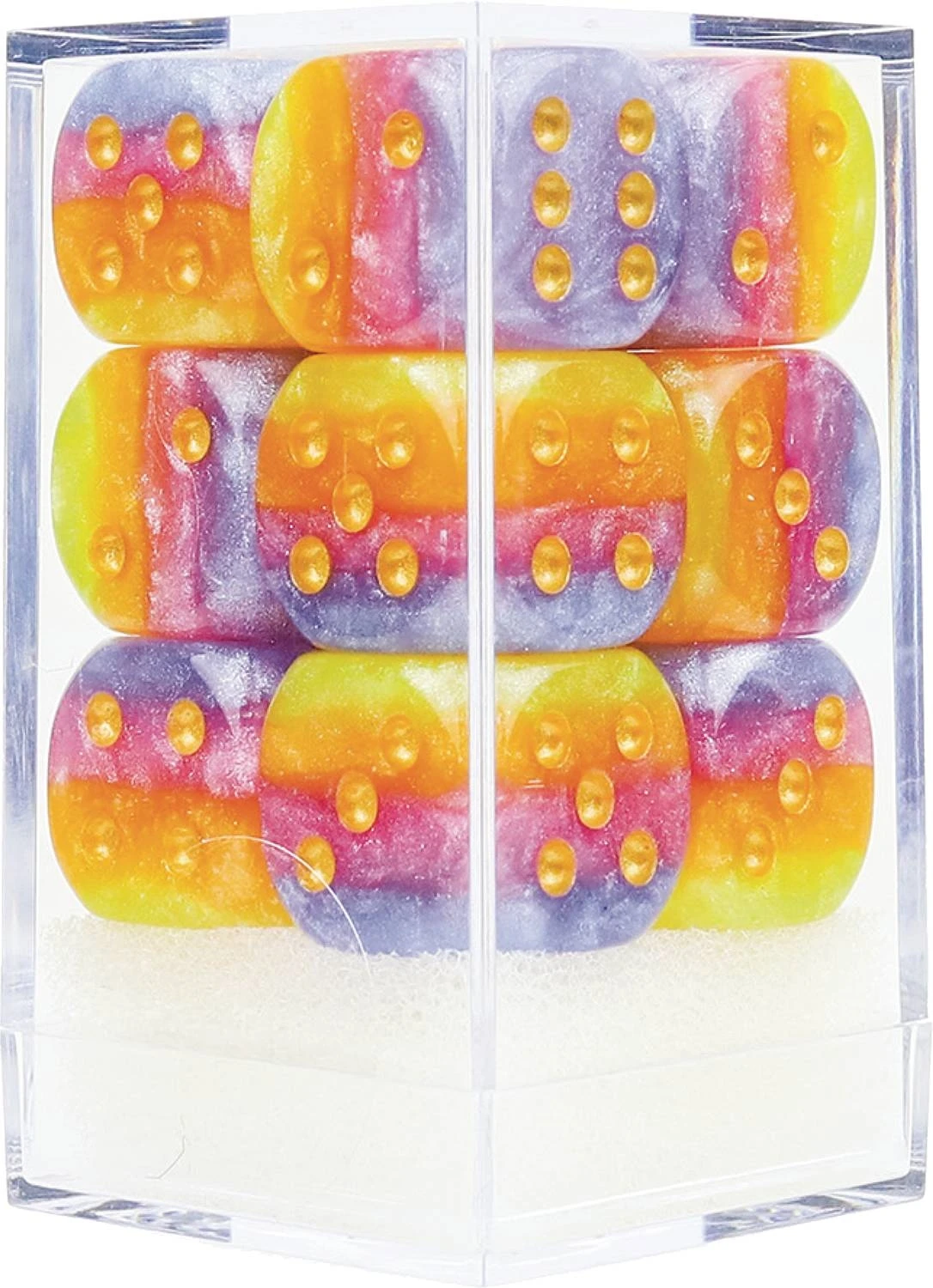 This 16mm 12-piece dice set features pastel hues of yellow, orange, pink, and purple infused with light-catching glitter.