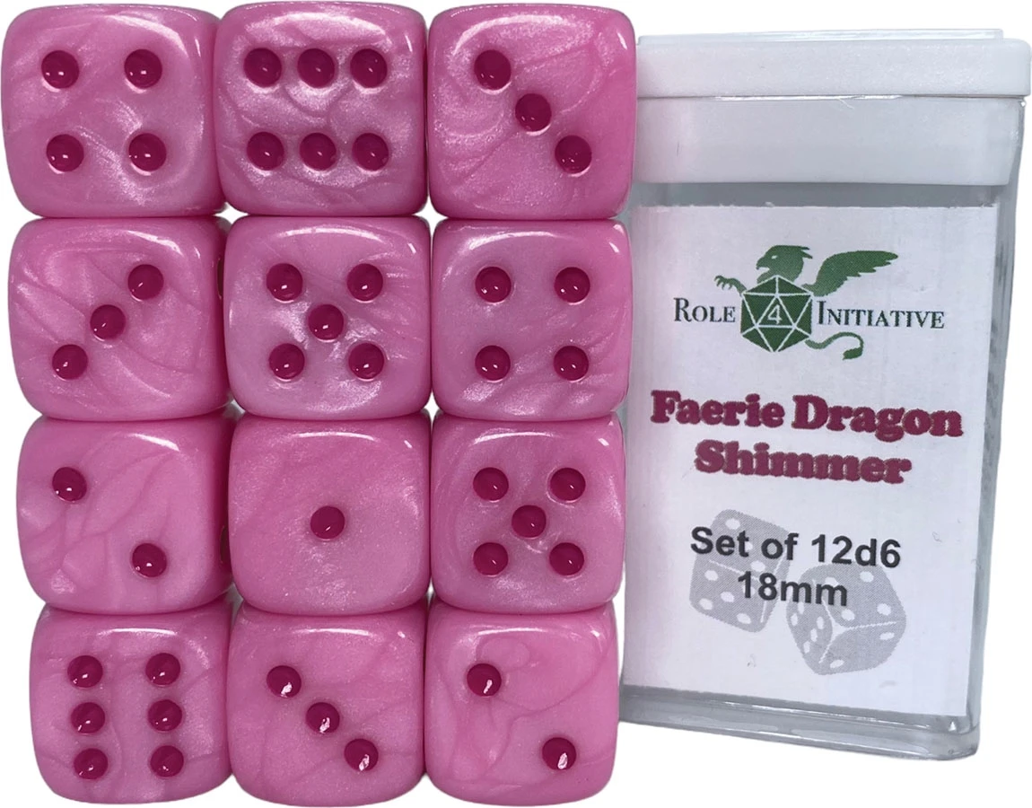 This block of 12d6 in Faerie Dragon Shimmer includes 18mm pipped dice that are over 40% larger than traditional 16mm dice for a hefty feel and bigger rolls.