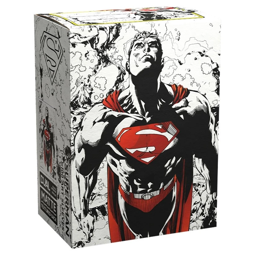 Upgrade your card sleeves to something truly super with Dual Matte Art Superman sleeves! Pay homage to this legendary superhero with unique sleeves that capture the spirit of Superman and his heroic ideals with an elegant color palette of red, black, and white. Dual Matte sleeves feature a black interior making the sleeves fully opaque while providing an elegant backdrop for black bordered cards. Dual Matte sleeves shuffle and handle like a dream. The sturdy cardboard box fits 75+ single sleeved cards or 65+ double sleeved cards. Every box has a label on the top for personalization. 100 sleeves per pack.