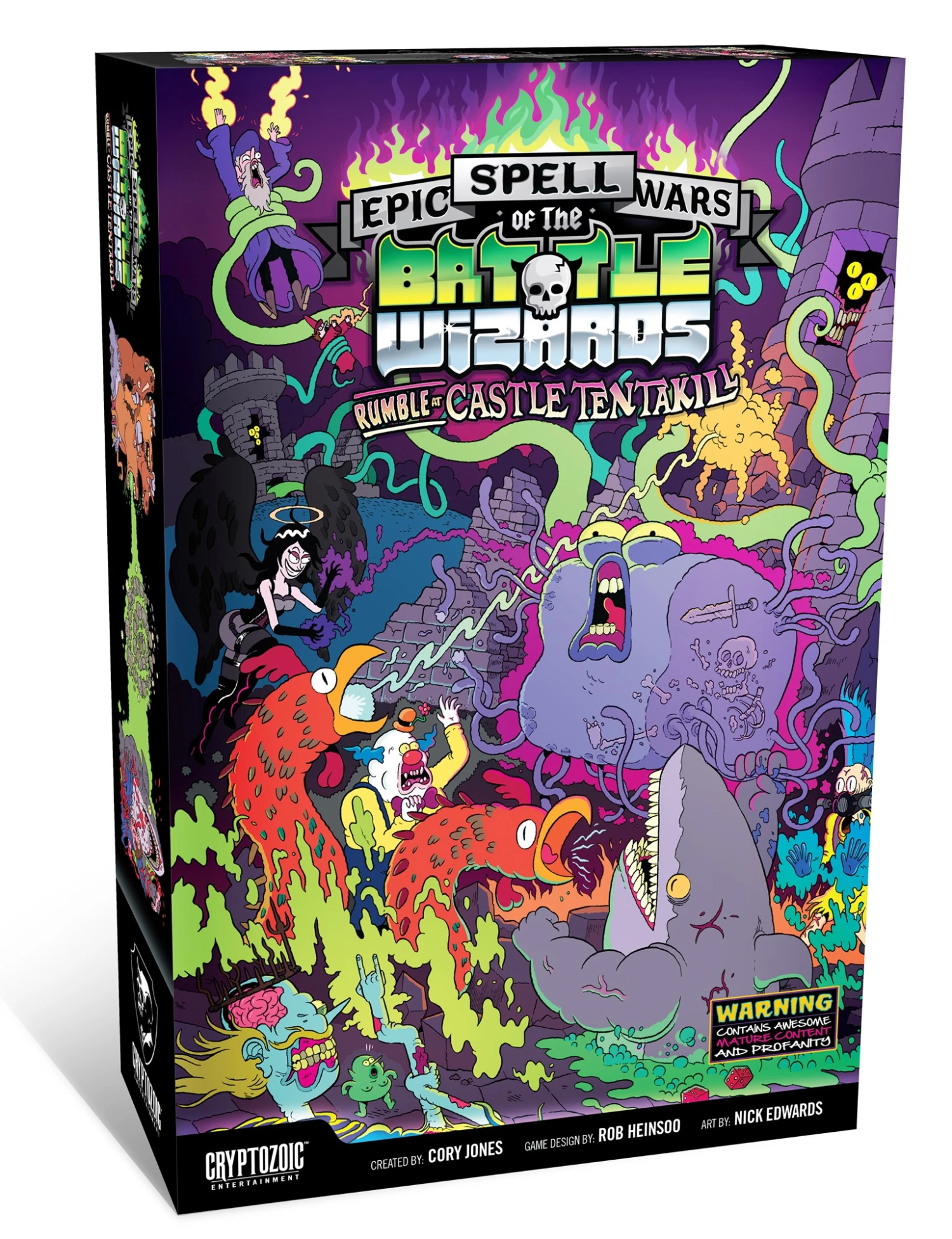 The sleeper hit has awakened! Epic Spell Wars of the Battle Wizards II: Rumble at Castle Tentakill is finally here and its loaded with all-new ways to deliver a smoking death to all who oppose you. Completely compatible with Epic Spell Wars of the Battle Wizards: Duel at Mt. Skullzfyre, this stand-alone expansion introduces Quick-Match mode for shorter play, and exciting, new cards and mechanics like Creatures that make you unstoppable, Blood Points to make spells even more powerful, and Reactions that allow spells to partially resolve even if you die too soon! Plus, the Standee matters! That crazy stand-up piece is now a coveted heirloom in the game, and if you control it, several of your spells will increase in strength. Mix the two sets together for the ultimate carnage-fest!
