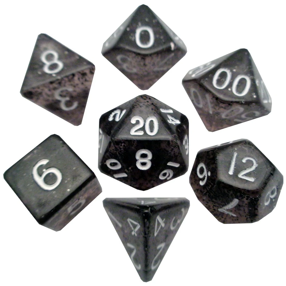 This set of seven 10mm Ethereal polyhedral dice are a mix of acrylic and glitter.