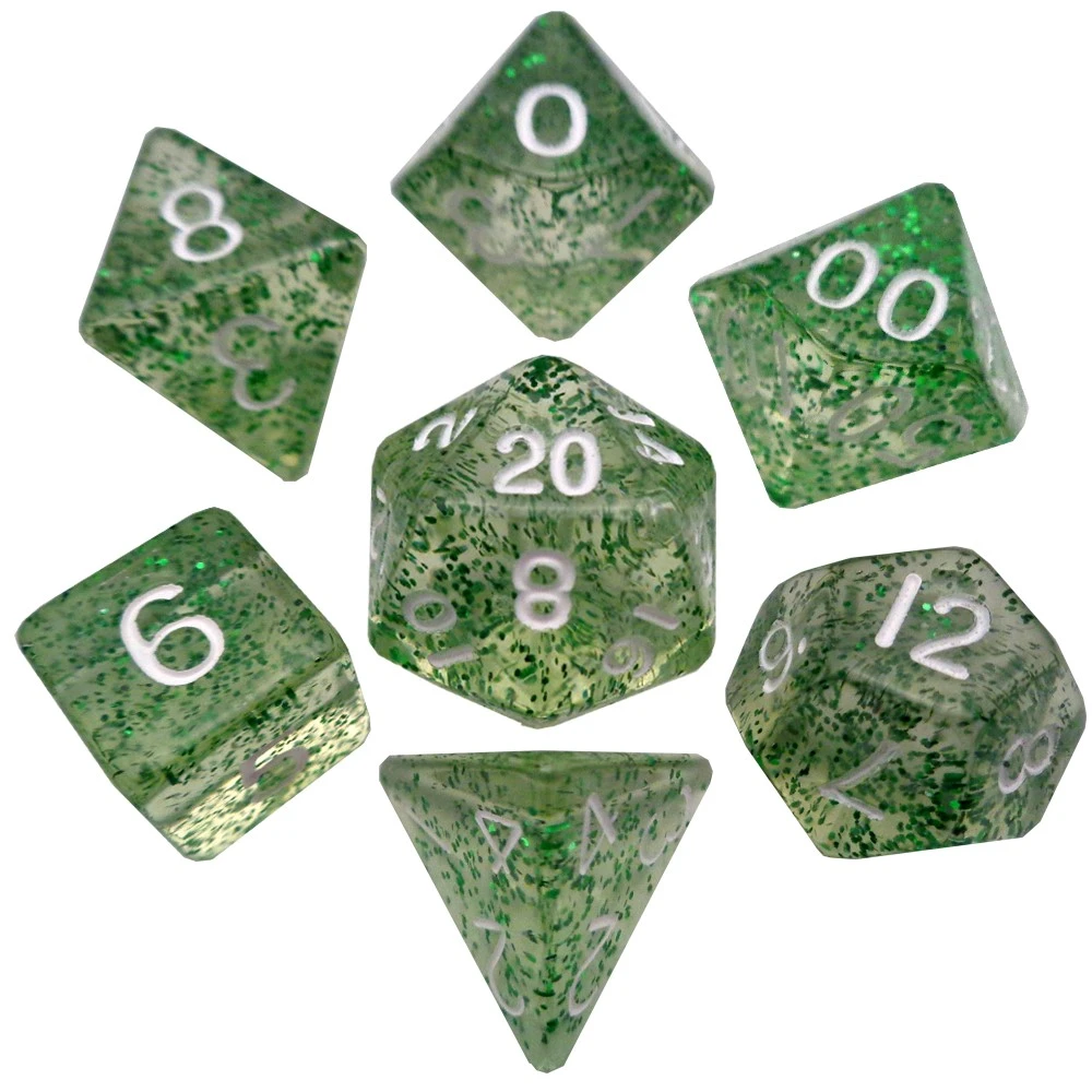 This set of seven 10mm Ethereal polyhedral dice are a mix of acrylic and glitter.