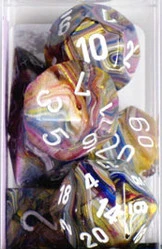 This set of seven dice includes one of each: d4, d6, d8, d10, d10 decimal, d12, and a d20.