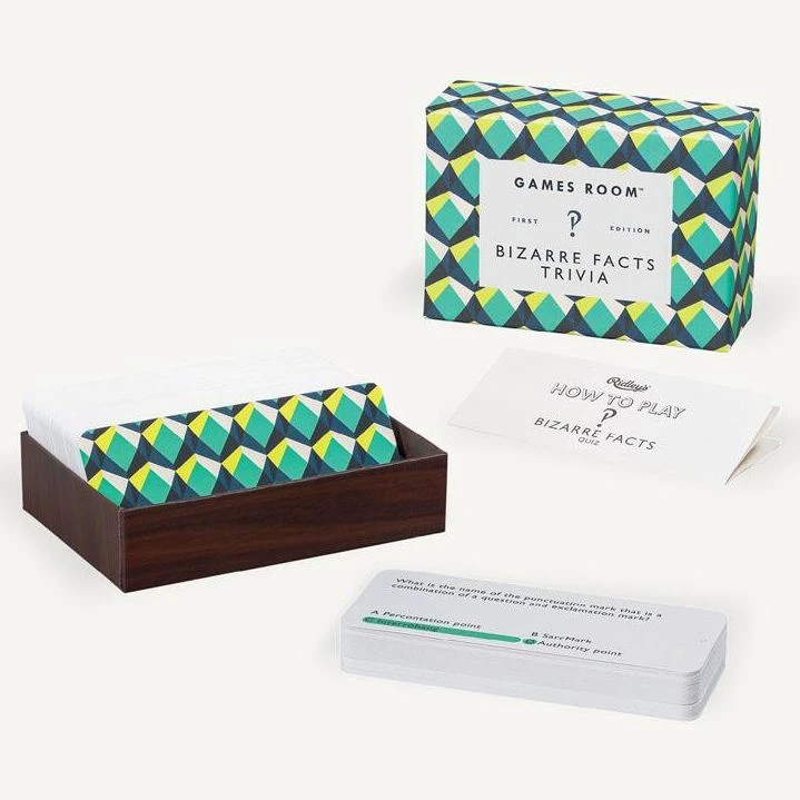 The bizarre-er the better with this Bizarre Facts Trivia from the Games Room collection. There are 140 quiz cards to test your knowledge of the unusual and absurd! A fun and factual game to play with friends. Presented in a stylish geometric print box. Full instructions included.