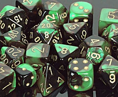 Gemini dice were introduced in 2006 and were immediately very popular. Each dice has a beautiful blend of two base colors, making these dice a unique addition to any dice collection. This set contains one d20, one d12, two d10 (00-90 and 0-9), one d8, one d6, and one d4.
