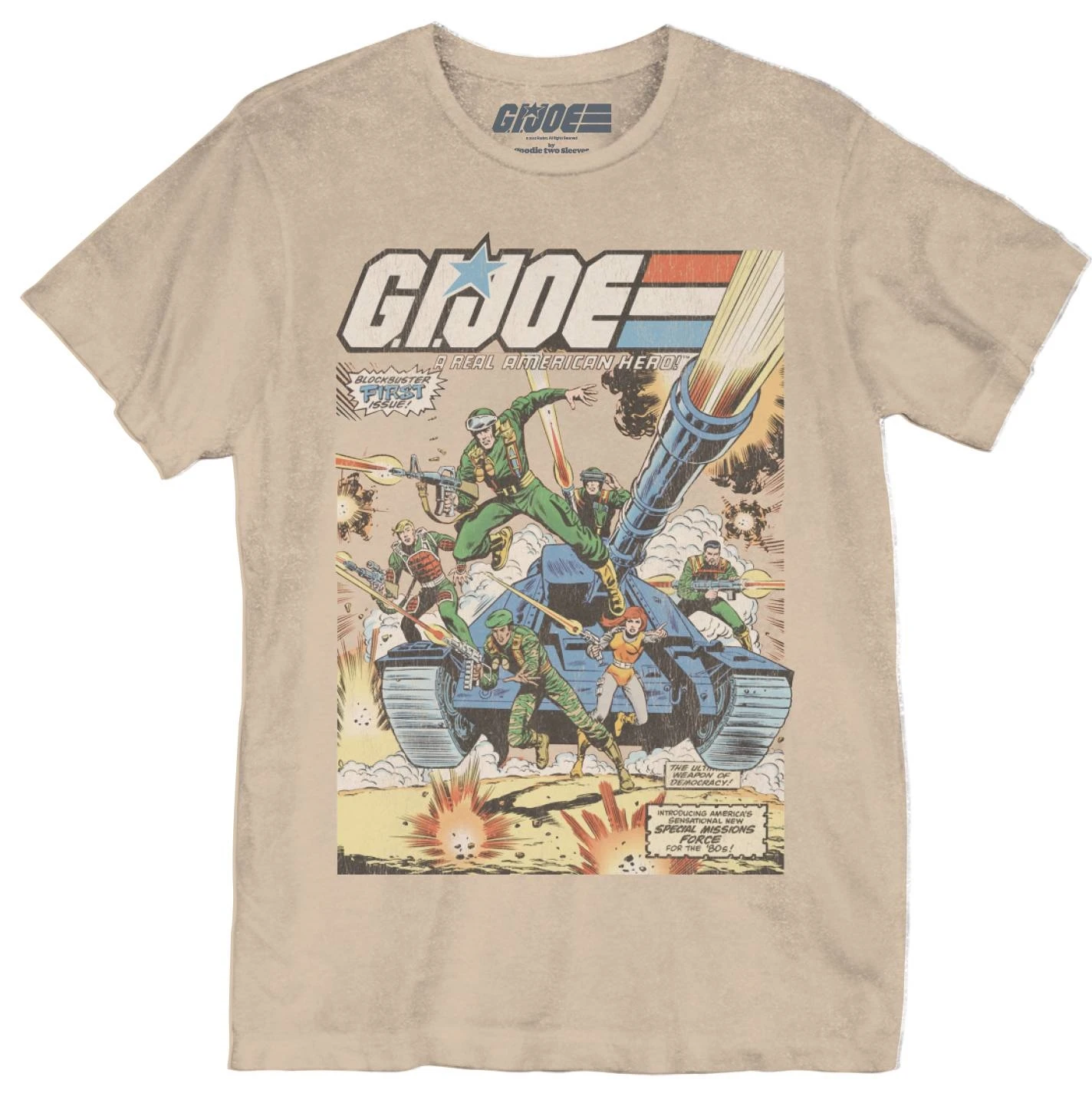 The classic cover to GI Joe #1 features on this distressed tan T-shirt.