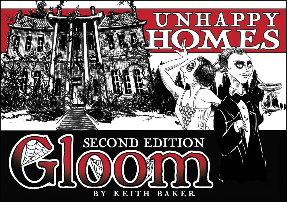 Gloom: Unhappy Homes adds new rules for Mysteries, Residences, and allows for an additional player to participate in the macabre mayhem. This second edition Unhappy Homes features new packaging, rules fixes, timing icons, reminder cards, and more.