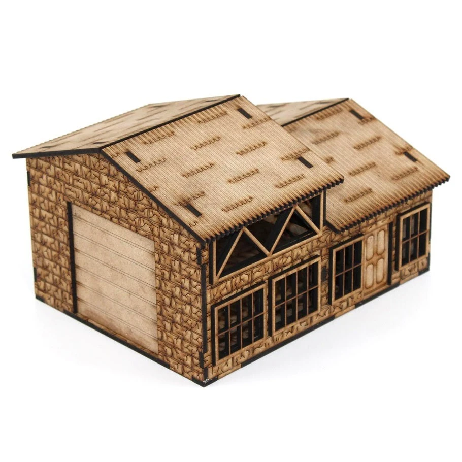 When you think of custom fabrication and distribution, think Sisko’s! Stop in to see our available stock or generate a product quote. This structure is one of a number owner operated franchises found throughout the frontiers or in the crumbling old cities. It features a pair of removable roofs and a accessories set of two table models, two shelving units, and two skids. Sisko’s occupies a roughly 6 by 8 inch footprint. The highest part of the kit is 5 inches from the base of the vehicle door to the peak of the roof. Designed for 28mm miniatures. Made of sturdy 3mm MDF board. Kits ship unassembled and unpainted.