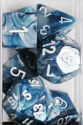 This set of seven dice includes one of each: d4, d6, d8, d10, d10 decimal, d12, and a d20.
