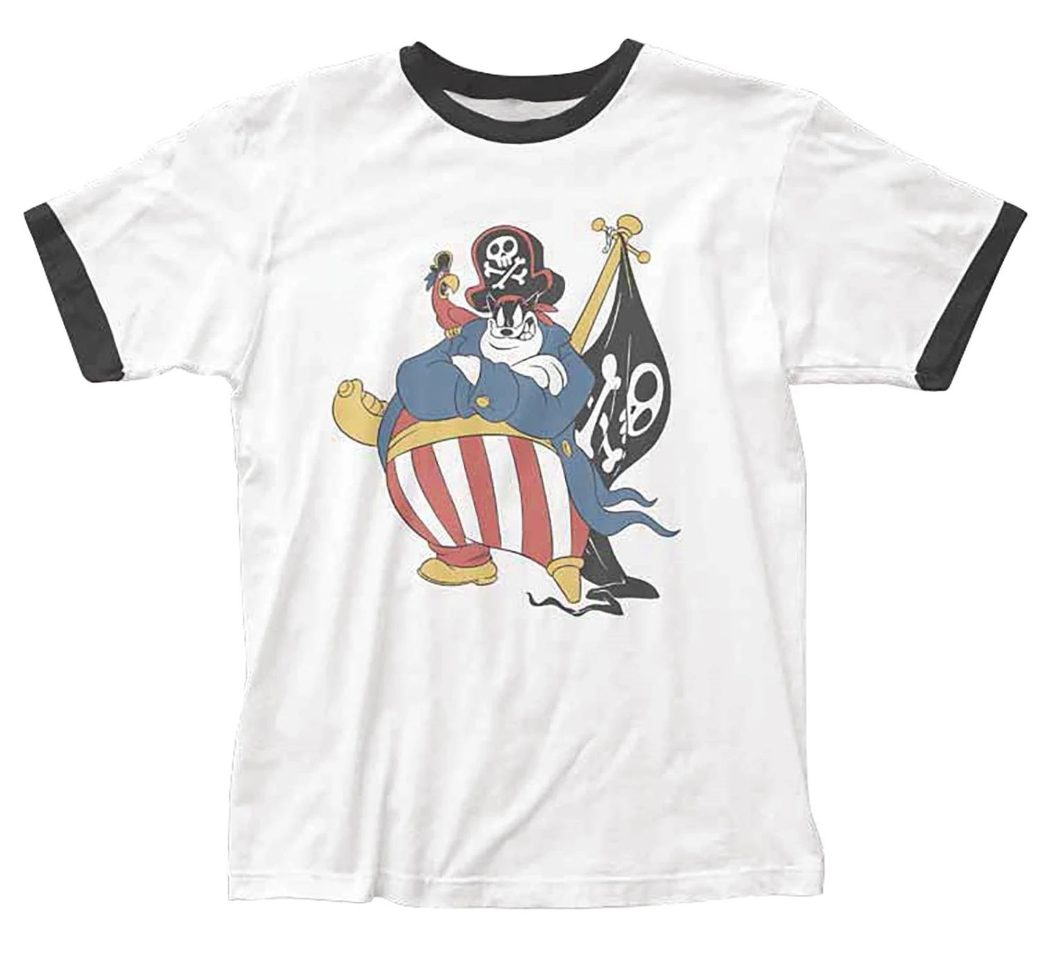 Mickey’s old nemesis Pete appears in pirate garb on this white and black ringer tee.