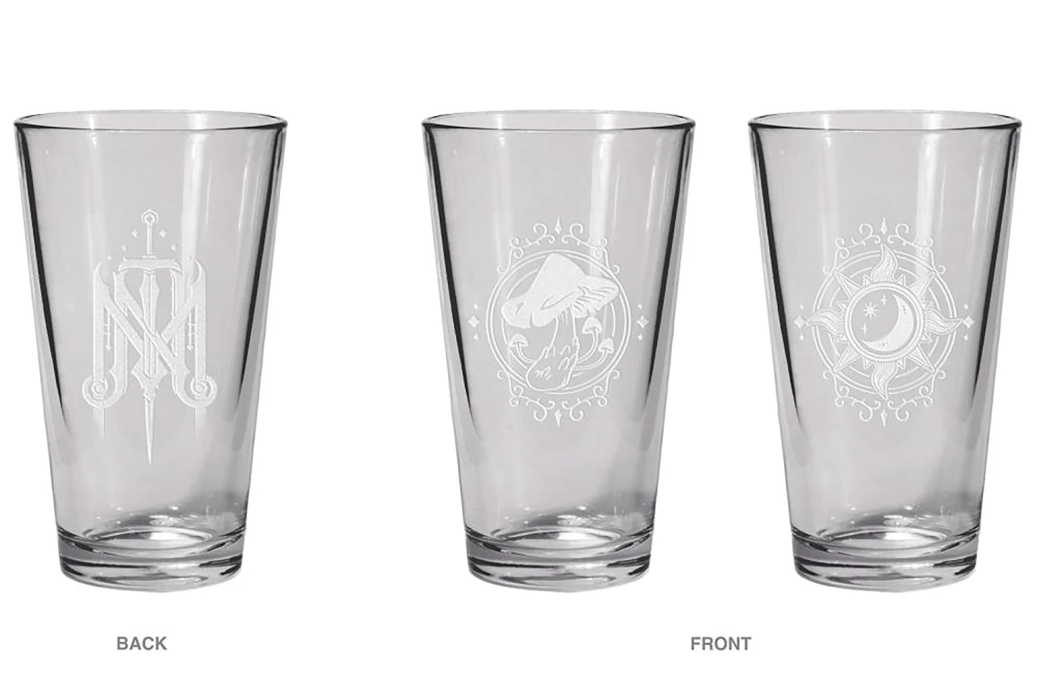 This pint glass set features symbols representing the ragtag adventurers from Critical Role: The Mighty Nein. Cheers! Caduceus Clay and Mollymauk Tealeaf: The maker of fine graves and even finer tea, and the tarot reading carnival king-long may he reign.