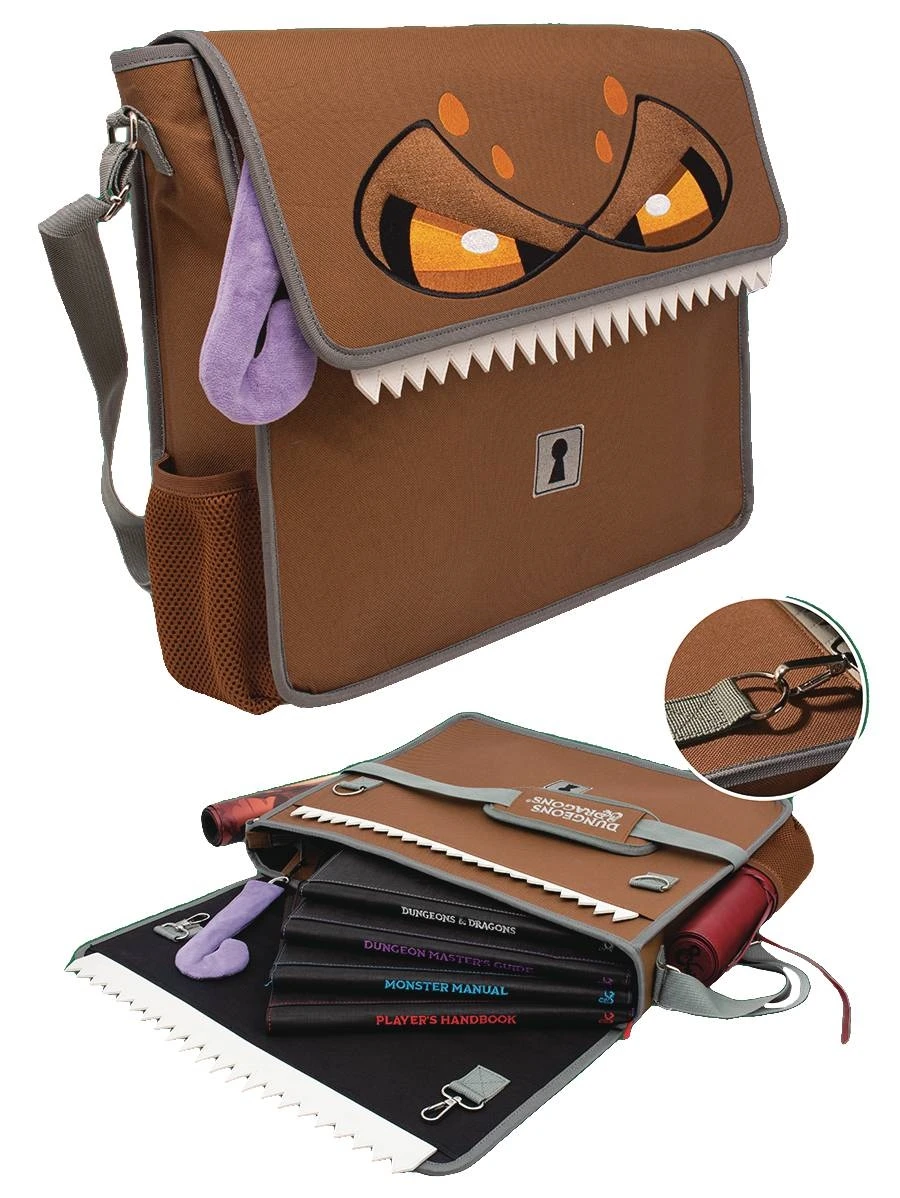 WARNING! This Bag has got bite! This officially licensed bag for Dungeons & Dragons features a water-resistant faux-canvas exterior, embroidered accents including eyes, lock and teeth, zipper with removable purple Mimic Tongue, and space for four D&D books and a secured space for a standard 17″ gaming laptop.