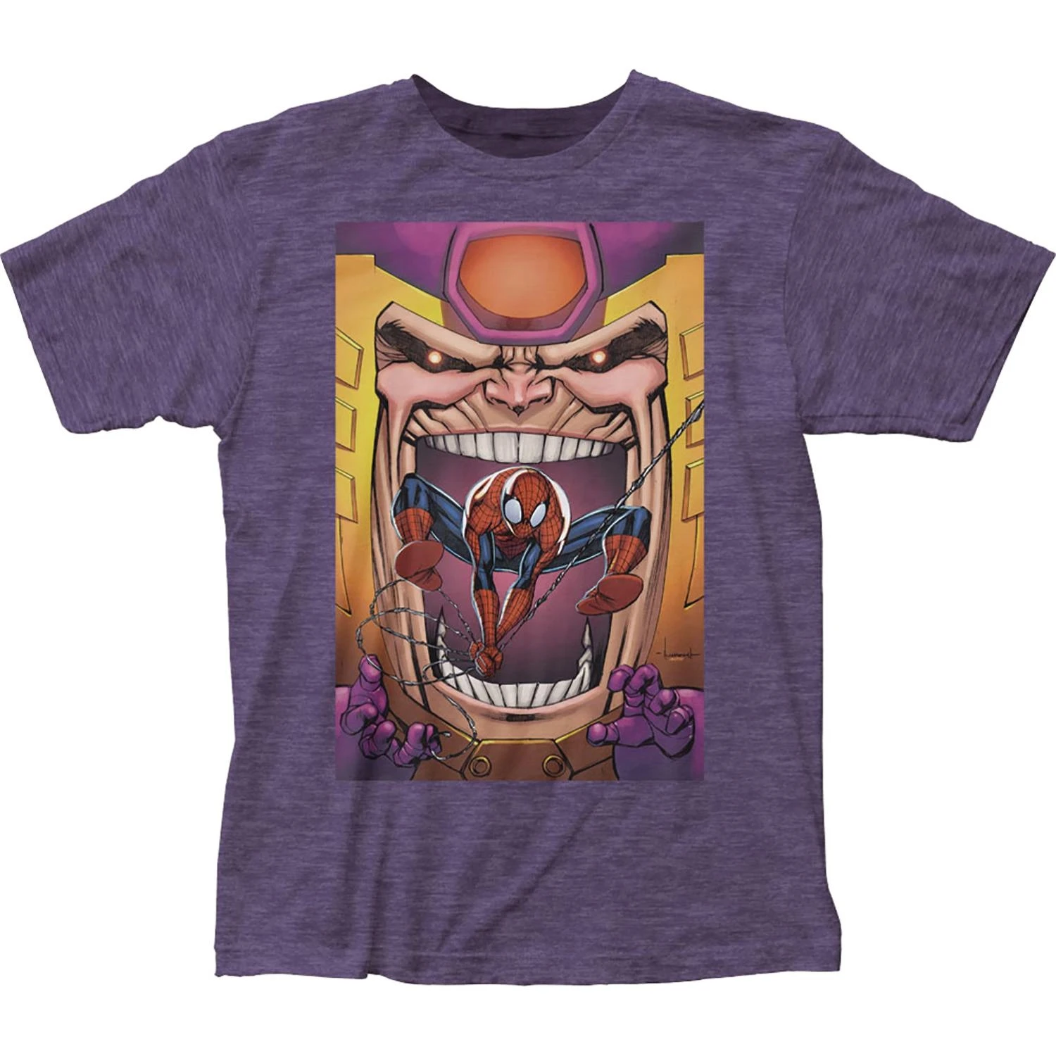 Spider-man swings away from the danger of MODOK in this PREVIEWS Exclusive tee. Available in sizes S-XXL.