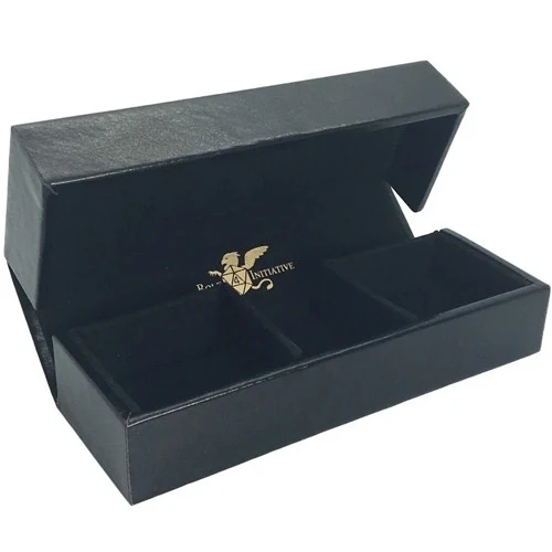 Role 4 Initiative’s dice box and rolling tray features a leather look exterior with soft felt interior. Three separate compartments hold up to 30 dice and/or 3 minis. Gold foil logos on both interior and exterior (R4I Logo) give it a touch of class. Convert between storage box and rolling tray in a snap. Magnets ensure the box stays closed during transport and remains open in the tray configuration for rolling dice. Packaging features a cardboard sleeve with a hang tab.