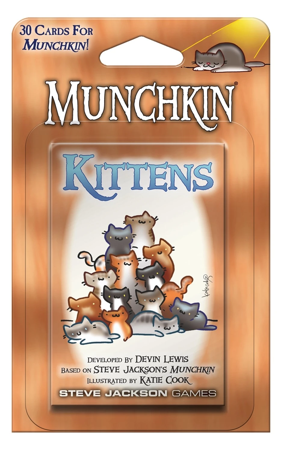 It’s a Cat-astrophe! Munchkin Kittens brings you 30 more cards for your Munchkin game, each one of them adorable and feline, and featuring fantastically cute art by Katie Cook (Munchkin Love Shark Baby)!