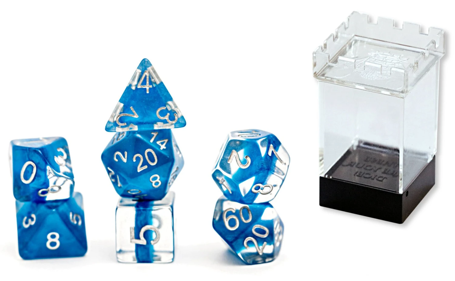 3-layer dice with transparent top and bottom layers. Poly set includes D4, D6, D8, D10, double-digit D10, D12, and D20.
