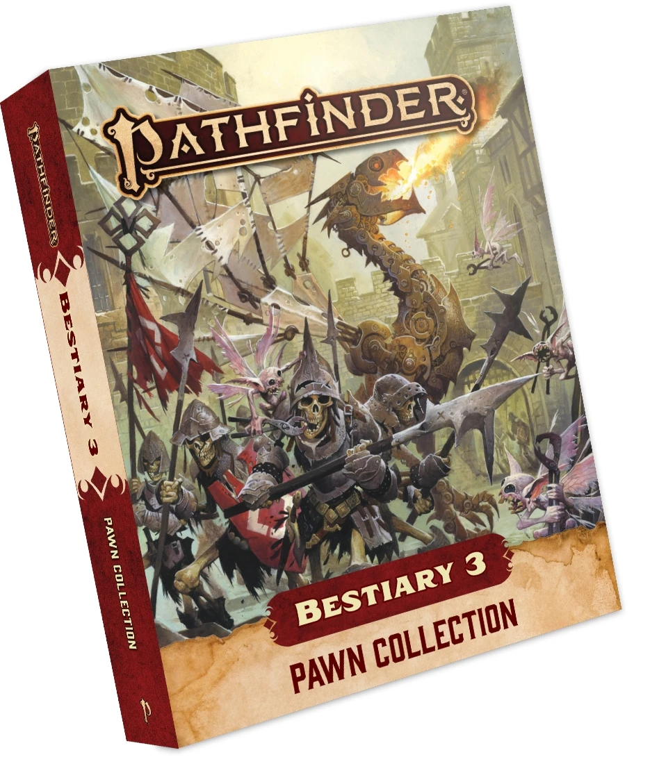 Complete the triple threat of monster pawns! The Pathfinder Bestiary 3 Pawn Collection collects the monsters found in Pathfinder Bestiary 3 and are perfect for use with the Pathfinder Roleplaying Game or any fantasy RPG. This collection presents beautiful full-color images of a wide array of new nasties, including more than 300 monsters such as dragons, clockworks, demons, devils, hags, kami, ouroboros, sprites, titans, valkyries, and more!