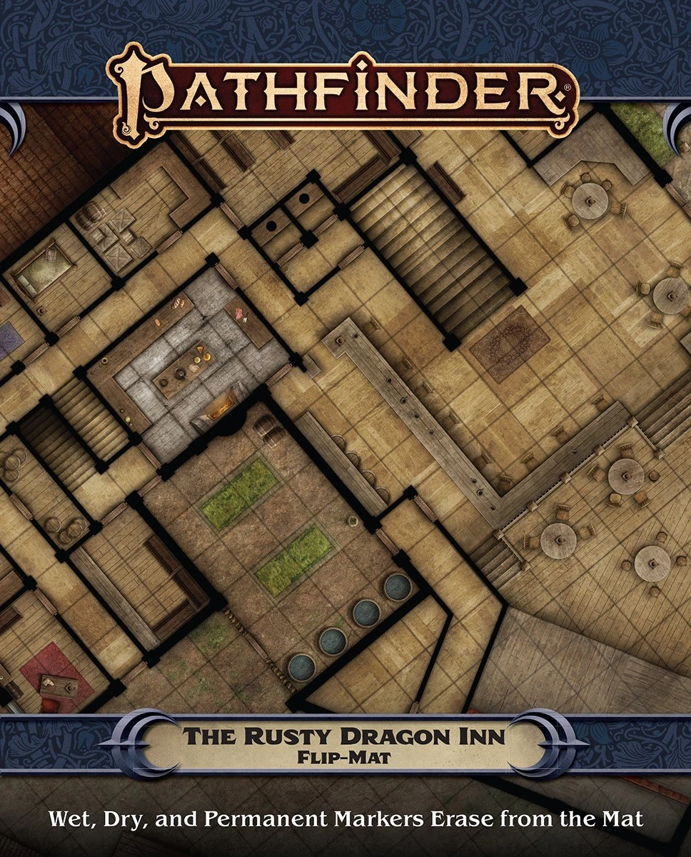 Pathfinder Flip-Mat: The Rusty Dragon Inn features one of Pathfinder’s most famous taverns—Sandpoint’s own Rusty Dragon Inn! One side shows the ground floor of this beloved establishment, while the other depicts its upper floors, the basement, and nearby rooftops. This portable, affordable map measures 24″ × 30″ unfolded and 8″ × 10″ folded. Designed for experienced GMs and novices alike, and usable with both dry-erase and wet-erase markers, Pathfinder Flip-Mats fit perfectly into any Game Master’s arsenal!