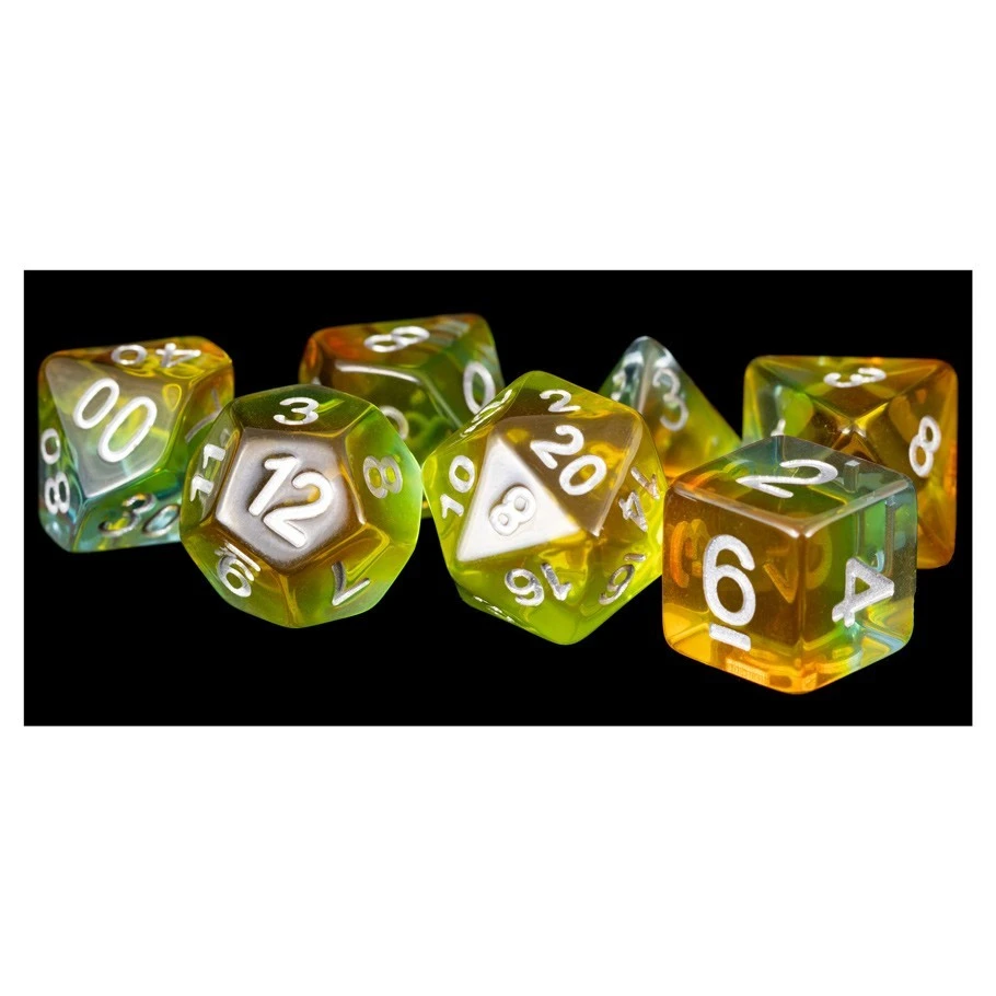 Yellow aurora polyhedral dice set with white numbers.