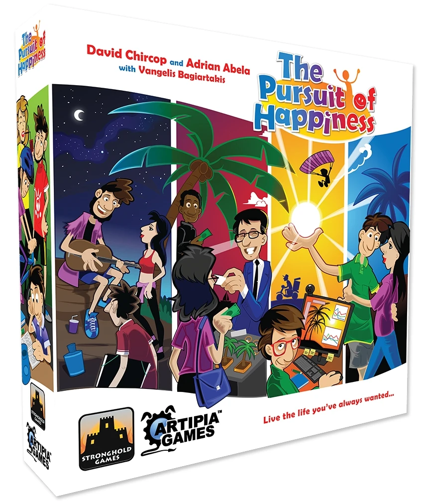 The Pursuit of Happiness is a game in which you take a character from birth and you live the life you always wanted. Using a worker-placement mechanism with time as your workers, you take on projects, you get jobs, you buy items, you establish relationships, you raise families. The possibilities are endless as you live the life you have always wanted. How much will you be able to achieve in just one lifetime?
