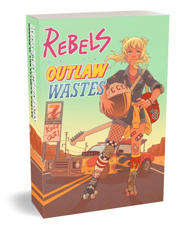 Rebels of the Outlaw Wastes is a gonzo adventure tabletop roleplaying game set in a film-grained, hyper-saturated retro-dystopia. Strike a blow against the tyranny of the Powers That Be and free the downtrodden of the Valley with the power of friendship, whoopass, and explosions! Create misfit mutants, rawkers, robots, and outlaws with a custom ruleset built for over-the-top storytelling and exciting vehicle and action scenes. Characters improve through an innovative sticker-based Badge System. Includes 150-page rule book and a complete set of stickers for one campaign.