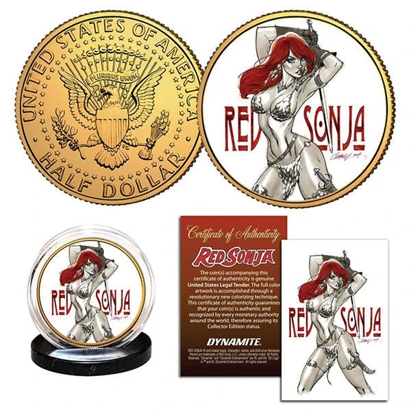 Featuring the art of Pinup Pro J. Scott Campbell! Produced using a revolutionary, highest-quality colorization technique on an authentic U.S. John F. Kennedy Half-Dollar, each plated in genuine 24-karat gold, these commemorative coins each come with a full-color Certificate of Authenticity and a protective acrylic coin capsule.