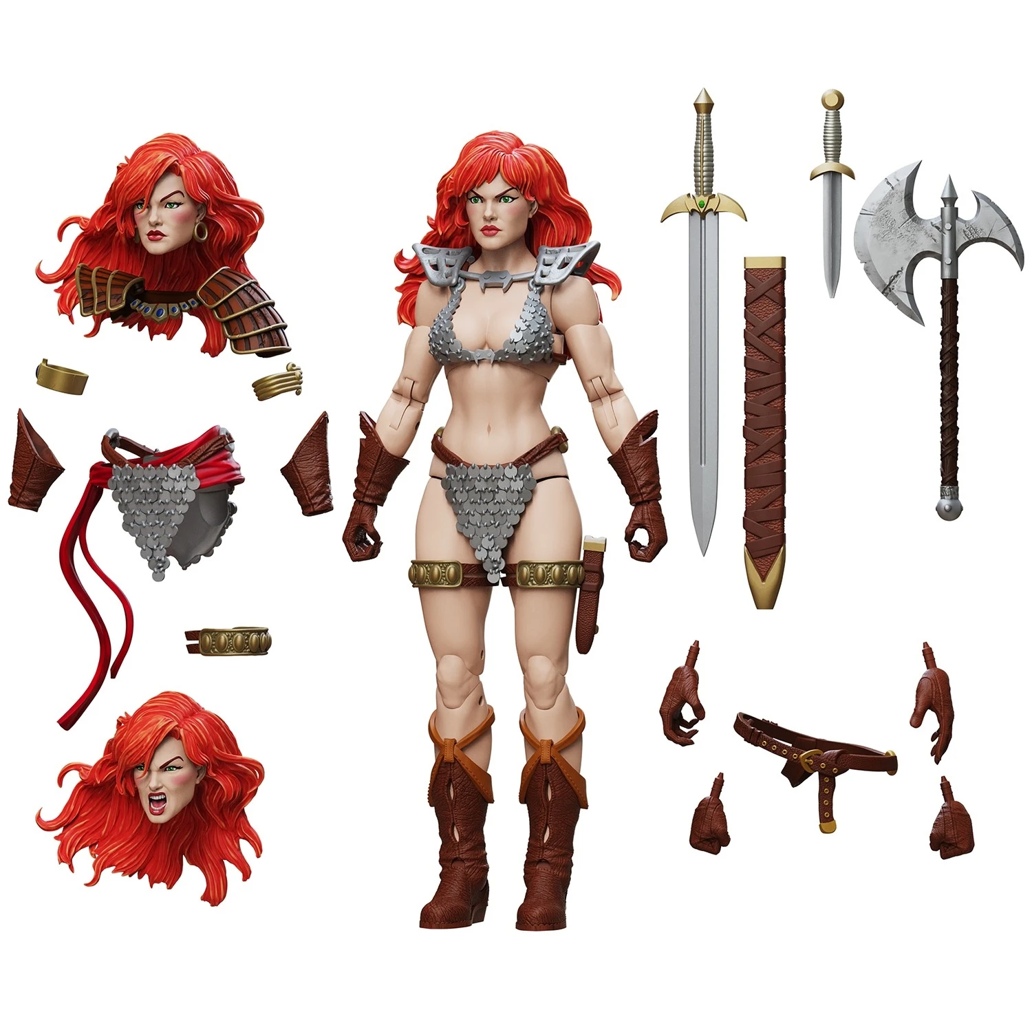 The baddest warrior around, Red Sonja, comes to life in a new epic Deluxe 1:12 scale action figure! This brand new collectible is the perfect way to celebrate her 50th Anniversary. Red Sonja comes with more than 30 points or articulation to get into almost any fighting stance you can dream up! The figure includes two different sets of armor, sword, sword sheath and belt, knife and sheath, axe, stand, three pairs of hands, three heads and two different hairstyles for your favorite Red Sonja look! This figure is part of the new Epic H.A.C.K.S. system providing tons of articulation, interchangeability, and customizability! Ages 12 and up. Small parts and sharp points may be present.