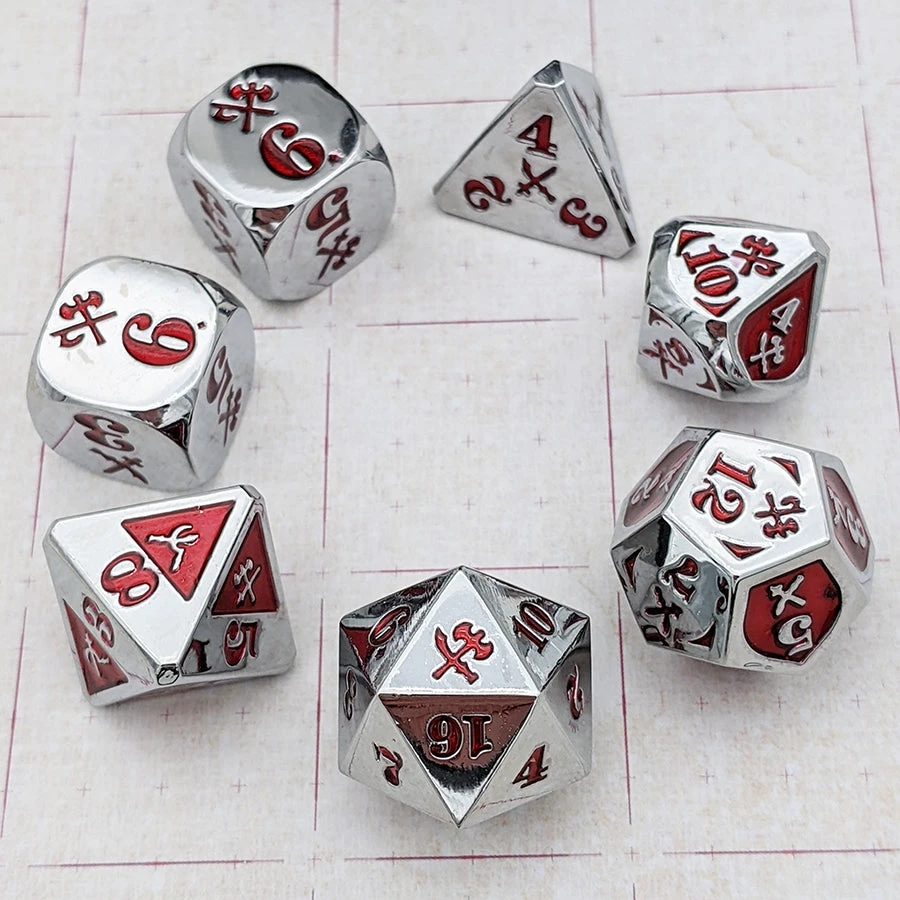 Polyhedral dice specifically designed, produced, and packaged for rolling Slashing damage in Dungeons and Dragons Fifth Edition. The base set of 7 dice can be used as your main set, or as a stylish supplement. The weight of this metal set delivers a satisfying roll for martial classes which don’t get the dice-waterfall damage rolls of magic users.
