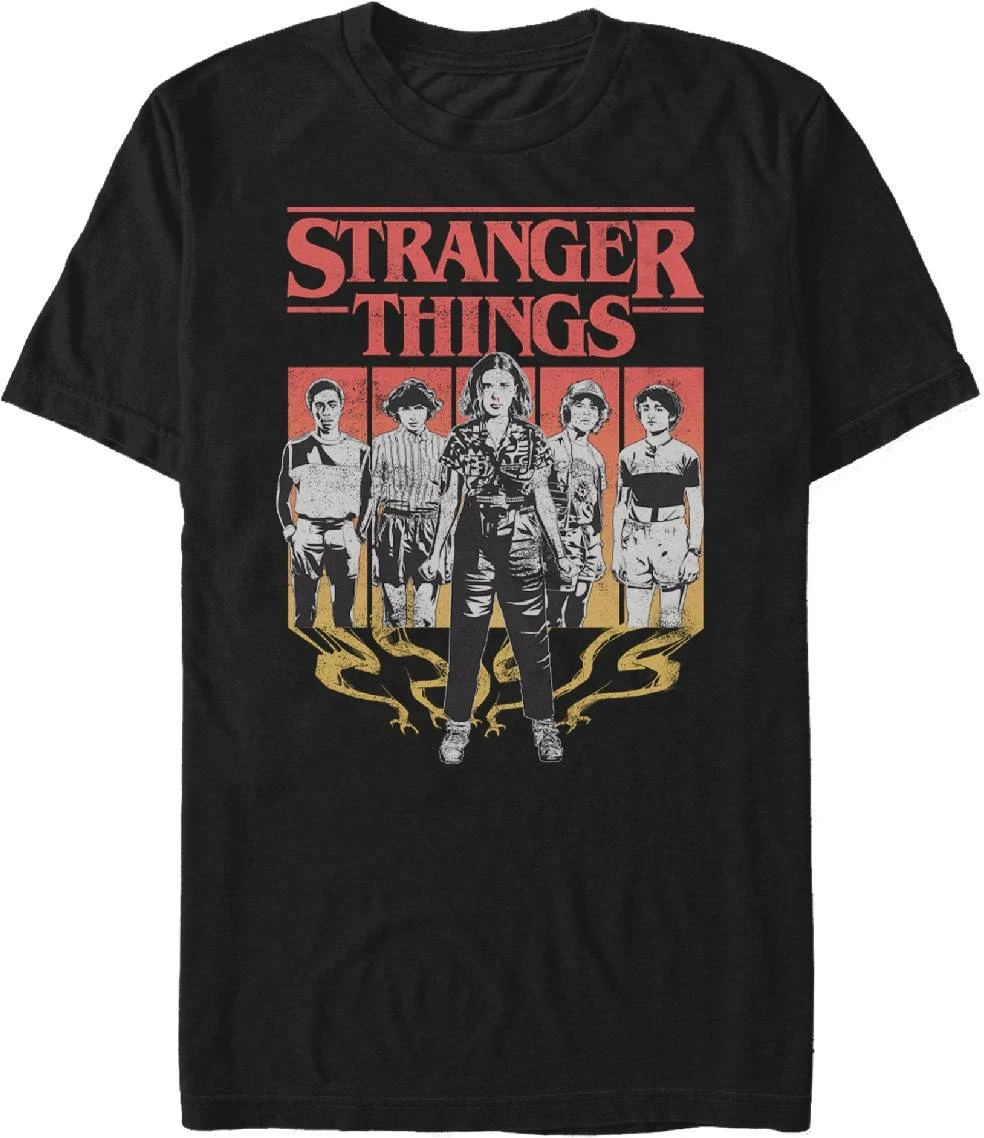 The stars of Stranger Things feature in black and white on this stark black T-shirt.