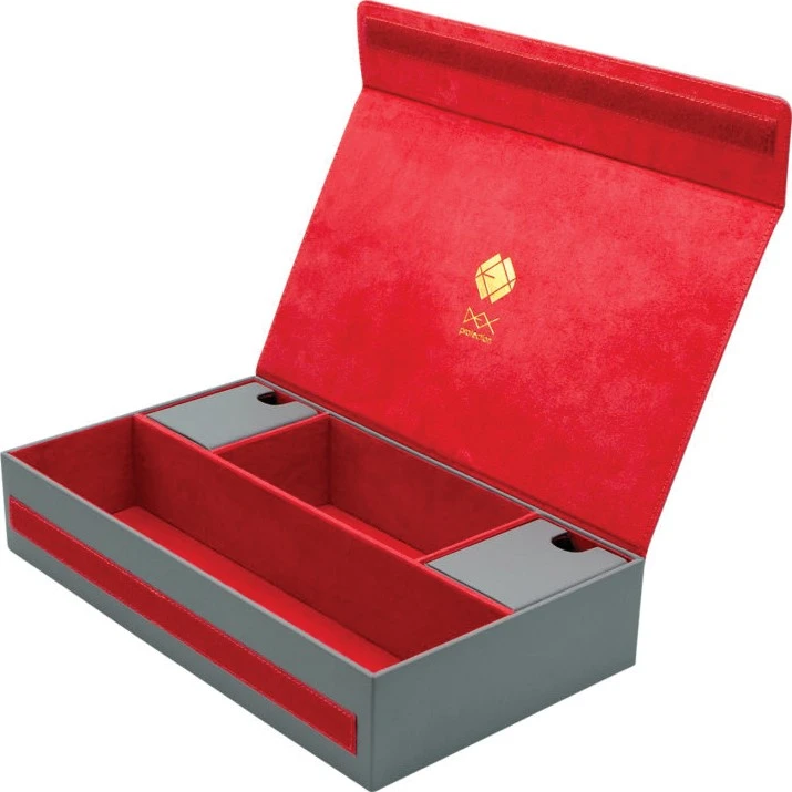 Two removable compartments. Holds over 850+ double sleeved cards. Suede interior. Secure velcro closing. Solid wood construction. Exterior dimensions: 378 x 213 x 82 mm.
