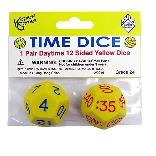 Forget the hands on the clock, these unique Time Dice sport a more digital look, perfect for modern times! Each set of dice includes an Hours 12-sided die and a unique Minutes 12-sided die showing time in five-minute increments. Koplow Time Dice are available in two color combinations: bright yellow Daytime dice and cool white Nighttime dice. Also available as an Elapsed Time Dice set with both.