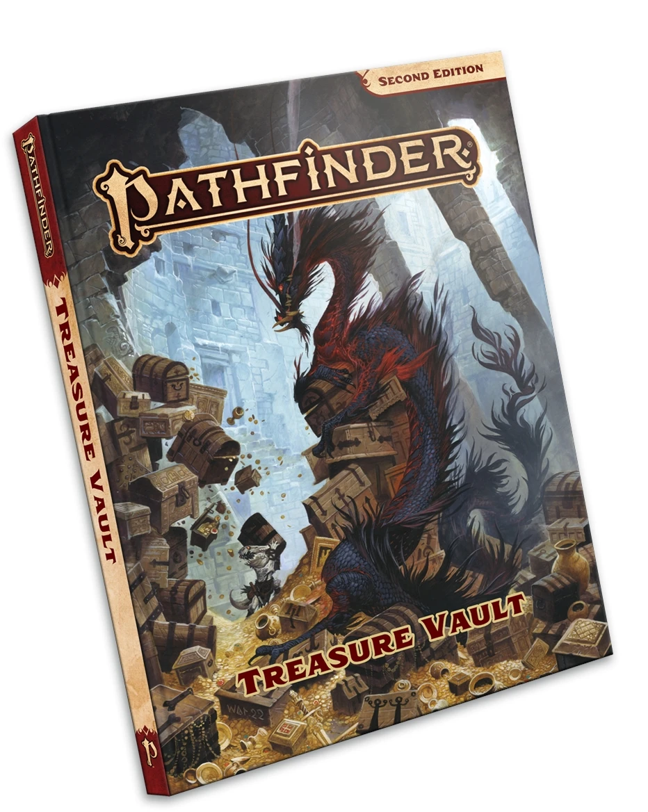Venture into the Vault! Pathfinder Treasure Vault reveals the glittering hoard of a terrifying dragon, as presented by the creature’s plucky kobold assistant. This 224-page hardcover rulebook presents a catalog of new gear from nearly every category of equipment and magic item available in the Pathfinder RPG while also introducing entirely new categories of items as well. Give your character the perfect tool for the job with signature weapons, customizable relics, and wondrous items to fit your every need while preparing for any eventuality with potions, elixirs, wands, and more!