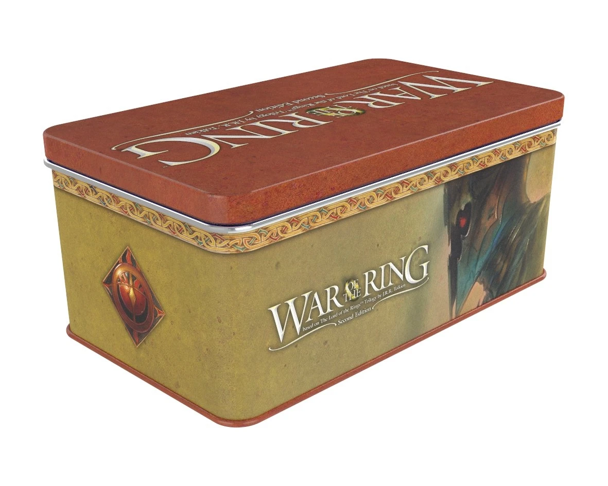 A beautifully illustrated metal card box, featuring John Howe’s illustration of the Witch-king, containing 120 custom card protector sleeves, fitting the tarot-size cards used in the second edition of the game.