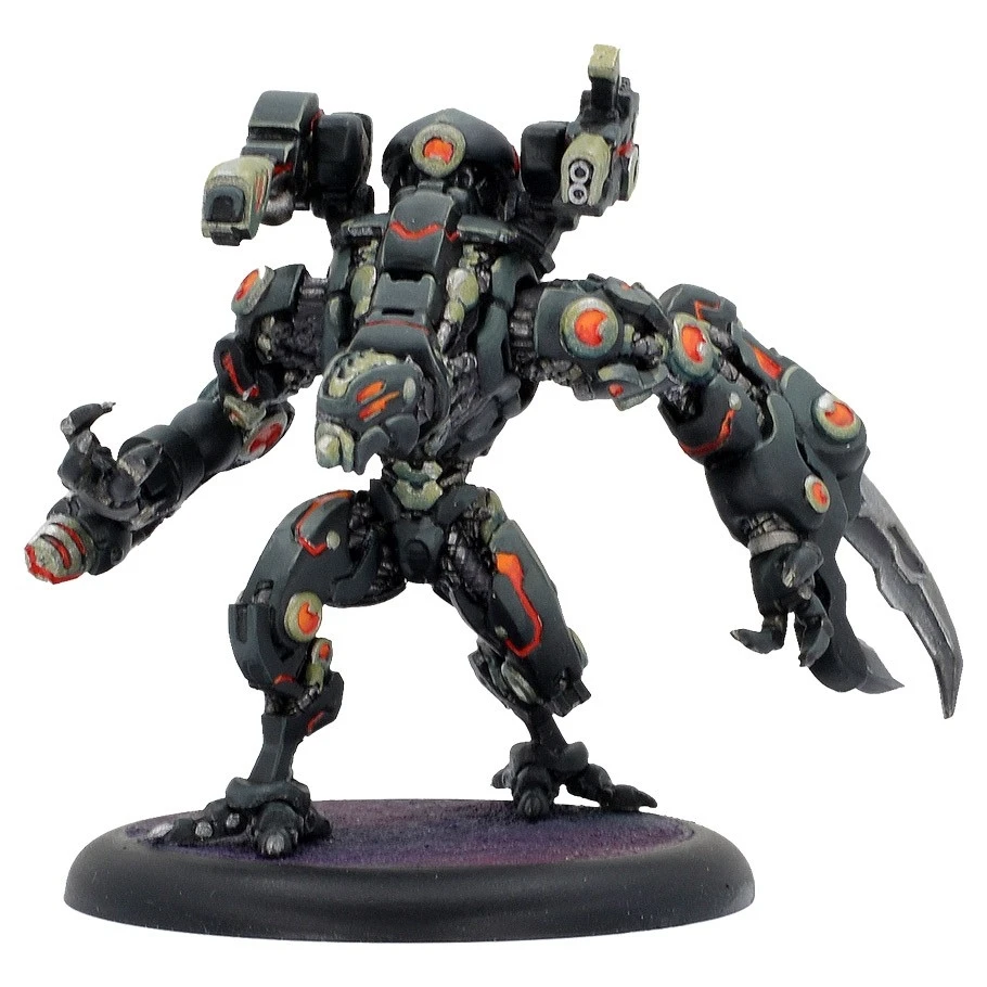 A misshapen horror of steel and malice, the Scourge is a brutally effective melee-focused warjack. Though it can be equipped with a variety of destructive weapons, the chassis defining features are its huge Wrecking Claw and iron-spring servos that can be charged to vastly increase the raw physical strength of the machine.