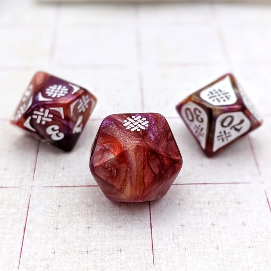 This d20 and pair of percentile dice are designed specifically for rolling Wild Magic Surges. The d20 has no markings except for one face — The Magic Symbol, The Weave, The Roll-On-That-Chaos-Table-Now Mark. If you’re secretly hoping for a 7 or 8 on the percentile dice, these are definitely for you.